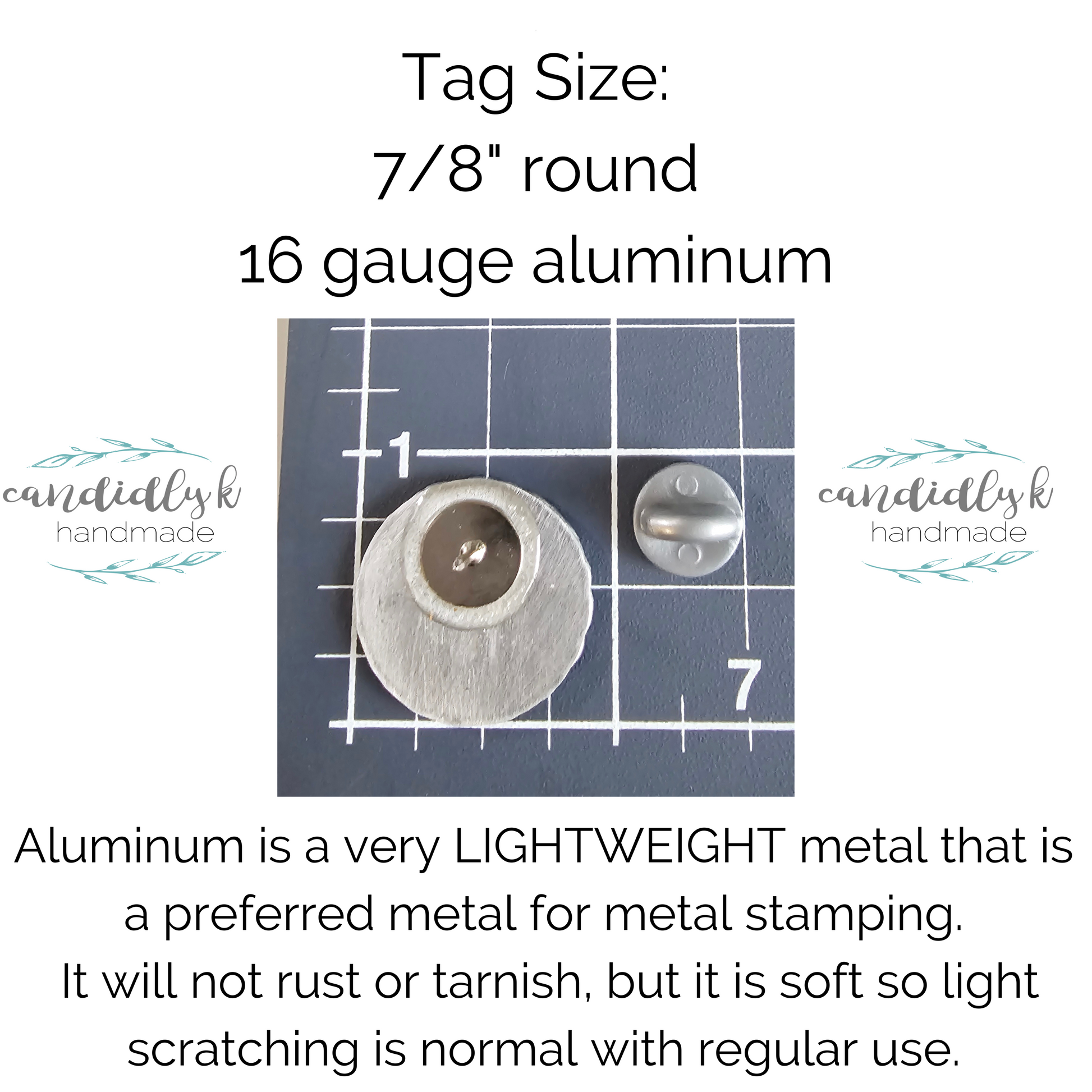 The aluminum disc is 16 gauge aluminum and measures 7/8" diameter. The aluminum plate has 1 pinback attached to the back. The pinback is attached with a long lasting epoxy.